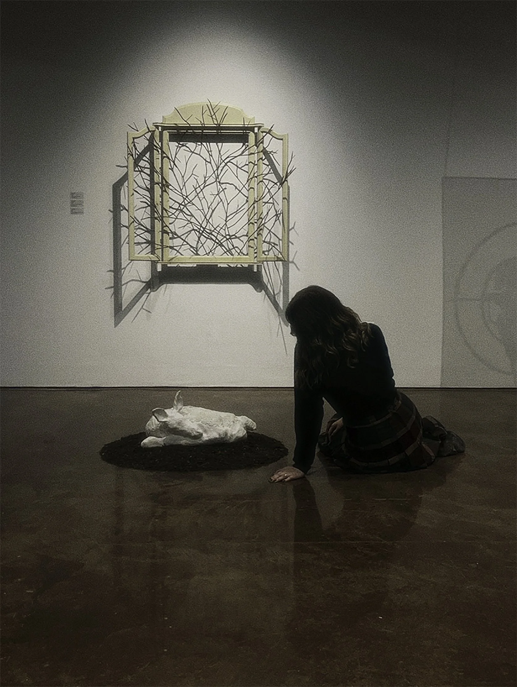 Within the narrative of Revenant, I explore what I have uncovered as I move through the landscape of my trauma ridden mind. The original trio of sculptures was fabricated for my senior thesis. The plaster fawn, adorned with plaster dipped doilies- serves as a physical manifestation of the girl that was corrupted by trauma. I laid that version of me to rest, but her ghost still haunts me. The delicate filet crochet tapestry symbolizes the strongest instance of the deceased fawn coming to the forefront of my mind- the act of being hunted for sport by men. Throughout my adulthood, I have been subject to this treatment, all while it was being disguised as an act of love and nurture. The mirror from my high school bedroom overcome with welded steel briar patches communicates the most intimate way I have reclaimed my identity- changing my name to Briar Mae.